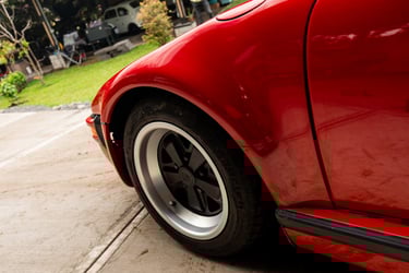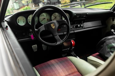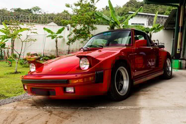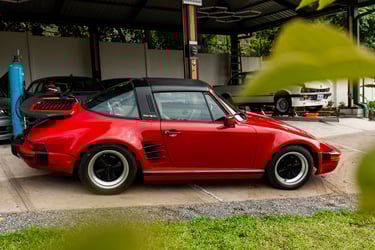 Este Porsche 911 Targa con conversiones estilo 930 Slantnose destaca por su agresivo diseño frontal tipo "Flachbau" y su silueta inconfundible. Restaurado con un enfoque que mezcla autenticidad y personalización, incluye rines Fuchs, interior con detalles en tartán y un estado mecánico impecable.